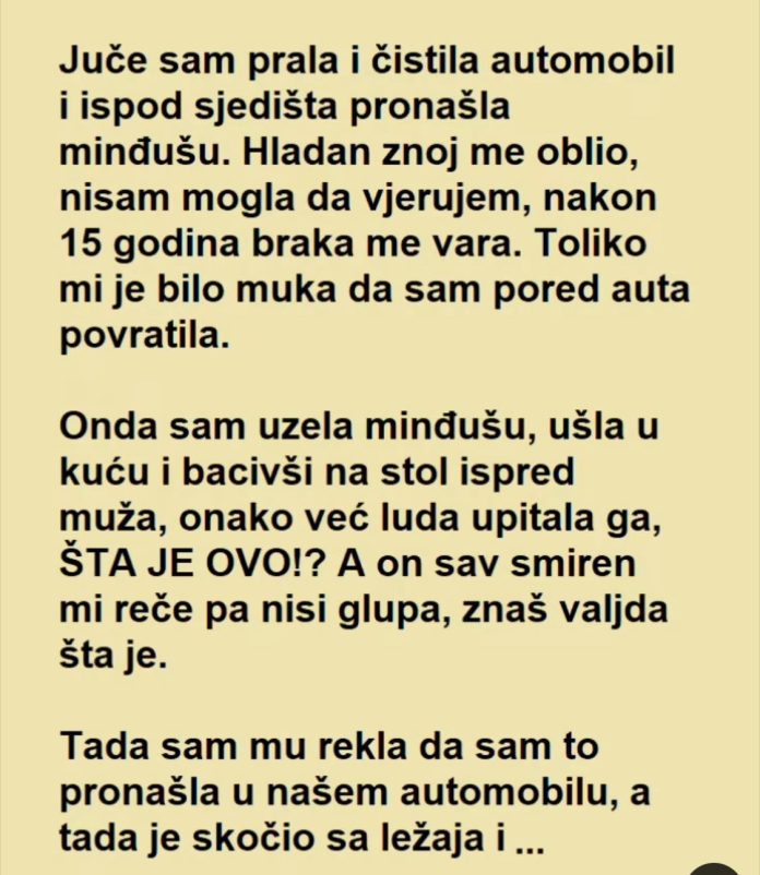 Kada je pronašla minđušu ispod sjedišta svog automobila, osjetila je kako joj srce preskoči. U trenutku kada je shvatila da ta minđuša nije njena, preplavila ju je jeza i strah. Mislila je kako je možda njen suprug vara, a ti osjećaji su bili toliko snažni da je jedva mogla zadržati svoju pribranost. Uzimajući u obzir sve godine zajedničkog života, ovaj trenutak se činio kao propast svega što je izgradila s njim. Sjećanja na njihove zajedničke trenutke, smijeh, podršku i ljubav, odjednom su počela blijedjeti, a ona se našla zarobljena u vrtlogu sumnje.