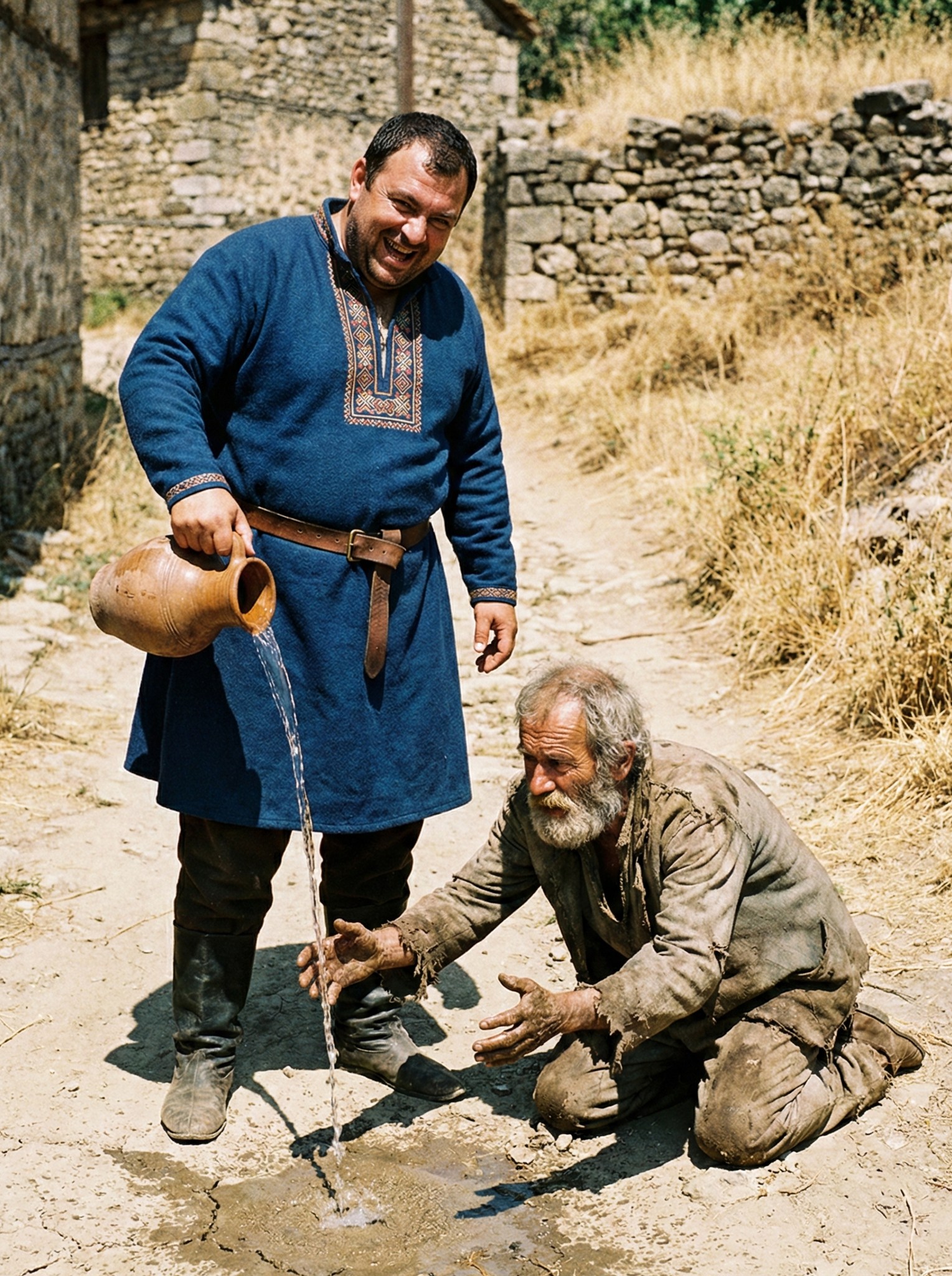U jednom malom selu, zima je donijela sušu koja je uništila usjeve i presušila bunare. Ljudi su se suočavali s teškim ispitom preživljavanja, dok su svakodnevno tražili vodu. Ova situacija nije bila samo obična suša; ona je simbolizirala borbu između ljudske pohlepe i neophodnosti zajedništva. U tom teškom vremenu, gazda Stojan, najbogatiji čovjek u selu, bio je jedini koji je imao bunar pun bistre hladne vode. Međutim, njegovo srce bilo je suho kao zemlja koja ga okružuje. Umjesto da pomogne svojim susjedima, Stojan je prodavao vodu po visokoj cijeni, smatrajući je svojim „tečnim zlatom“ koje je morao zaštititi od svih potencijalnih „lopova”. Ova situacija jasno oslikava kako pohlepa može zaslijepiti čak i one koji imaju mnogo, ostavljajući druge u patnji.