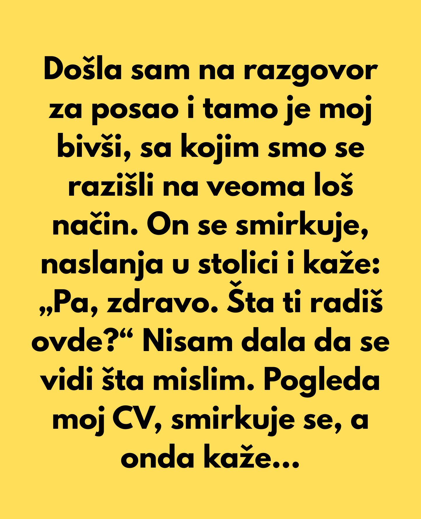 Kada sam stigla na razgovor za posao, nisam ni slutila da ću se suočiti s bivšim dečkom. Naš raskid bio je daleko od mirnog – pun nesporazuma i emotivnih bolova. Svaka veza nosi svoje terete, a naš je imao svoje posebne težine. Dok sam ulazila u kancelariju, njegovo lice se pojavilo kao nagli podsjetnik na sve ono što smo prošli. On se smireno naslonio u stolici, kao da je sve u redu, i pozdravio me s nekom vrstom cinizma. “Pa, zdravo. Šta ti radiš ovde?” upitao je, dok je pregledao moj CV s izrazom koji je teško bilo protumačiti. Njegov ton bio je nonšalantan, ali u njegovim očima mogao sam vidjeti odsjaj prošlosti koji nas je oboje progonio.