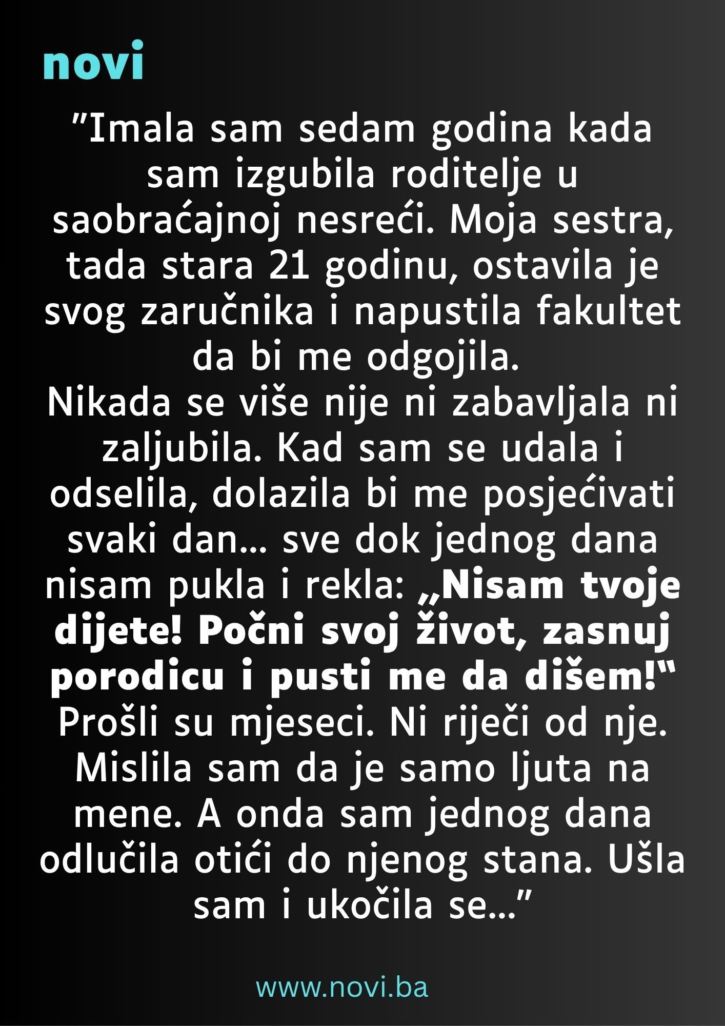 Kada sam posetila moju sestru, zatekla sam prizor koji je promenio moj pogled na njen život. U njenom domu su se nalazile igračke, knjige i mala odeća. Prvo sam bila zbunjena, ali onda sam saznala da je odlučila da udomi devojčicu koja je, poput nas, ostala bez roditelja. Iako je to bio dug i složen proces, nije želela ni na koji način da deli ovu odluku dok nije bila potpuno spremna. U tom trenutku, shvatila sam da je njena potreba da se brine o nekome drugom bio dubok deo njenog identiteta, a ljubav koju je pružala meni sada je prenosila na novog člana porodice. Ovo otkriće nije samo promenilo moj pogled na nju, već i na naše zajedničke vrednosti. Gledajući kako se brine o toj devojčici, počela sam da razumem dubinu njene ljubavi i posvećenosti. Bilo je to vreme kada sam shvatila da ljubav ne poznaje granice, da se može širiti i rasti kroz nove veze. U tom trenutku, moja sestra nije samo bila moja zaštitnica, već je postala i majka drugoj devojčici, čime je stvorila novu porodičnu dinamiku koja je obogatila sve nas.