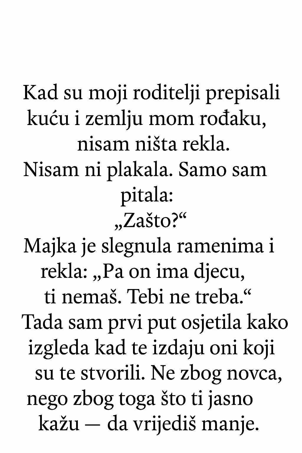 Moja majka je, s tugom u očima, odgovorila: „On ima djecu, a ti nemaš. Njima je to potrebnije.” Njene riječi su me pogodile poput groma. U tom trenutku, nisam plakala ni vikala. Osjećala sam gorku realnost svoje situacije — da sam, prema njihovom mišljenju, manje vrijedna. To nije bio samo gubitak materijalnog, već gubitak emocionalne povezanosti i ljubavi koju sam očekivala od svojih najbližih. Odjednom sam se našla u situaciji gdje je materijalna vrijednost postala važnija od odnosa koje smo gradili kroz godine. To je izazvalo pitanje: da li je ljubav zaista uslovljena onim što imamo?
