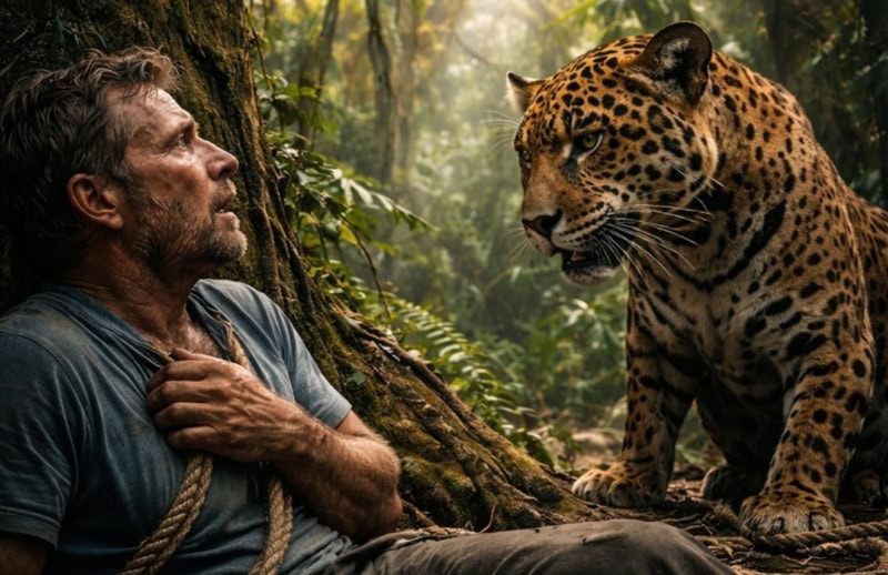Kako je vrijeme prolazilo, jaguar se neočekivano okrenuo i ugrizao konopac koji je vezivao čovjeka. Njegovi zubi su polako kidali čvorove, oslobađajući ga iz ropstva. Ova scena bila je nevjerovatna – predator koji umjesto napada pruža pomoć. Čovjek nije mogao vjerovati vlastitim očima. Bilo je to iskustvo koje će zauvijek promijeniti njegov pogled na divlju prirodu. Ovaj trenutak obilježava preokret u naraciji, gdje se instinkt za preživljavanje preklapa s nekom vrstom čiste dobrote koja dolazi iz nepredvidivog izvora.
