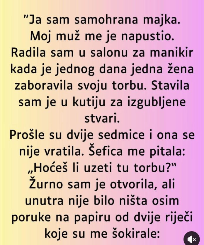 Jednog dana, dok je radila u salonu, u njemu je ostavljena torba koju je jedna klijentkinja zaboravila. U početku, to nije djelovalo kao ništa posebno. Uobičajena situacija – zaboravljeni predmeti su se često skupljali u kutiji za izgubljene stvari. No, kada su prošle sedmice i niko se nije vratio po torbu, šefica je pitala šta da učine s njom. Naša junakinja ju je radoznalo otvorila, ali unutra nije bilo novca ni vrijednih stvari, samo mali papirić sa riječima: „Za tebe.“ Ovaj jednostavan natpis je izazvao više pitanja nego odgovora, ostavljajući je zbunjenom, ali i sa osjećajem nade.