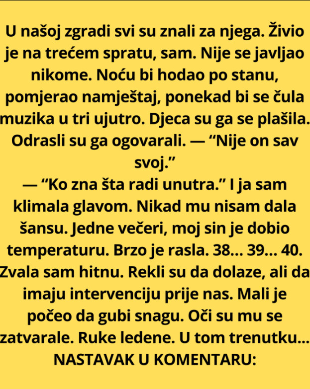 U jednoj običnoj zgradi, na trećem spratu, živio je čovjek kojeg su svi poznavali, ali ga zapravo niko nije poznavao. Njegovo ime je bilo često izgovarano među komšijama, ali rijetko je bilo prilika da se s njim porazgovara. Kada bi prolazio hodnikom, njegov miris samoće bio je gotovo opipljiv, a pogled mu je uvijek bio uprt u pod. Njegova tišina izazivala je znatiželju, ali i strah, dok su komšije pokušavale shvatiti šta se krije iza te nesvakidašnje osobe.