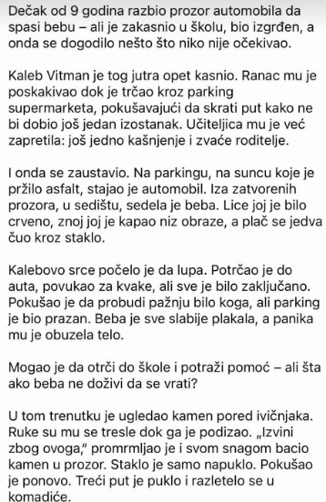 Na sunčanoj vrućini, unutar automobila, ležala je beba. Njeno lice je bilo crveno od vrućine, a suze koje su se slivale niz obraze su se jedva čule kroz zatvorena stakla. Iako nije bio stariji od dvanaest godina, Kaleb je intuitivno razumeo ozbiljnost situacije. U tom trenutku, osećao je kako mu srce ubrzano kuca, a svaka sekunda se činila kao večnost. Za njega, to nije bila obična scena; to je bilo pitanje života i smrti. Gledajući bebu koja je izgledala bez pomoći, Kaleb je znao da mora delovati brzo.