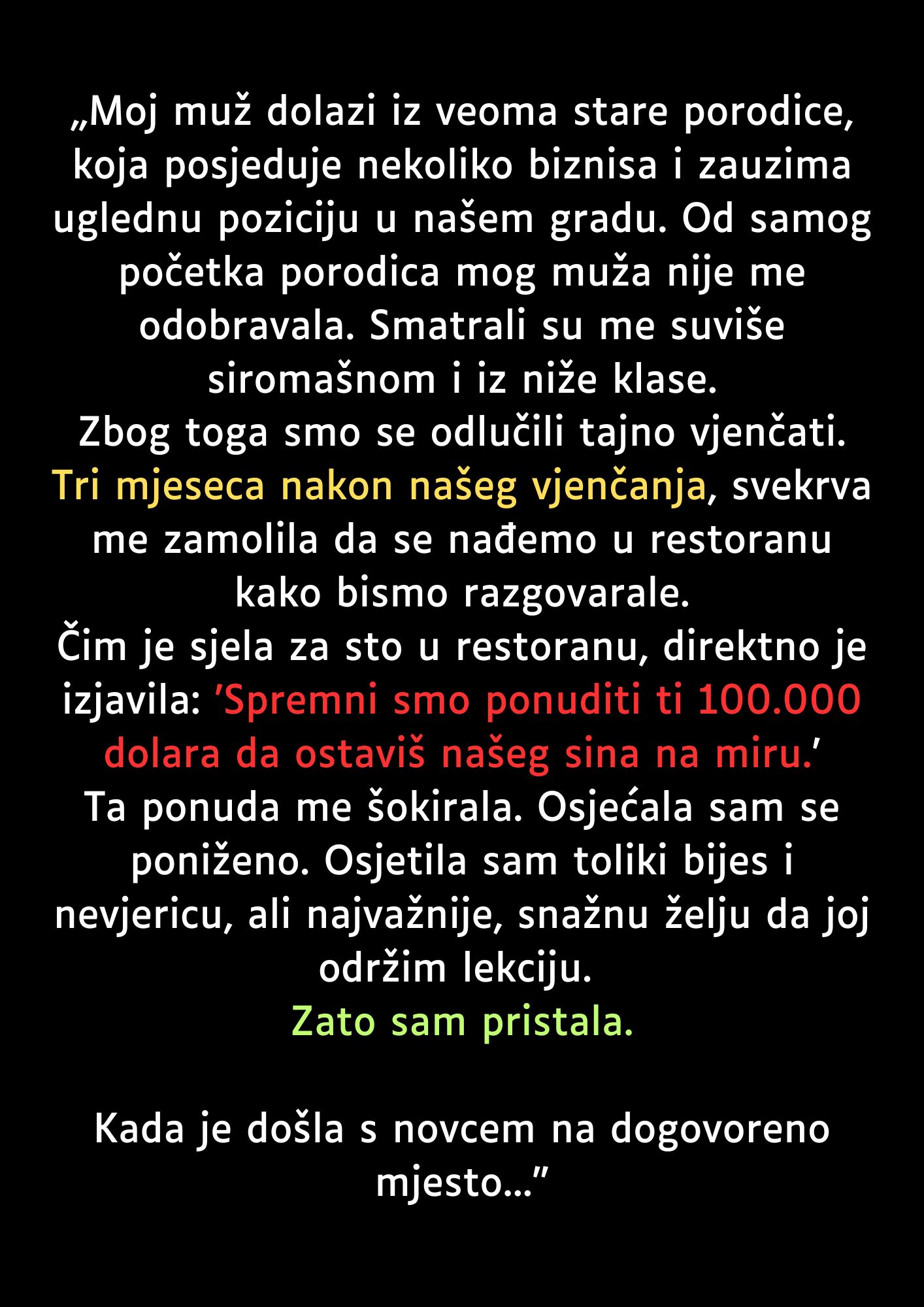 Nakon tri mjeseca zajedničkog života, moja svekrva me iznenada pozvala na sastanak. Očekivala sam razgovor o našoj vezi, no umjesto toga, ona je odmah prešla na stvar. U restoranu, smirenim tonom, izjavila je: “Mi smo spremni da ti ponudimo 100.000 dolara kako bi napustila našeg sina.” Ova ponuda me šokirala do srži. Osjećala sam se kao da su mi oduzeli pravo na ljubav, a novac je bio samo sredstvo manipulacije koje je pokušavalo da me udalji od onoga što najviše volim.Bijes i razočaranje koji su me obuzeli brzo su se pretvorili u odlučnost. Umjesto da prihvatim ponudu, odlučila sam se boriti za svoju vezu i pokazati svojoj svekrvi da se ne dam lako. Ovaj korak nije bio jednostavan, ali sam shvatila da moram postaviti jasne granice. Na sastanku sam se odlučila obratiti policiji i prijaviti pokušaj podmićivanja. Policija je brzo reagovala, a ja sam osjećala olakšanje što ću konačno imati podršku u ovoj borbi. Odbacivanje ponude nije bio samo moj čin, već i način da se jasno izrazim i pokažem snagu.