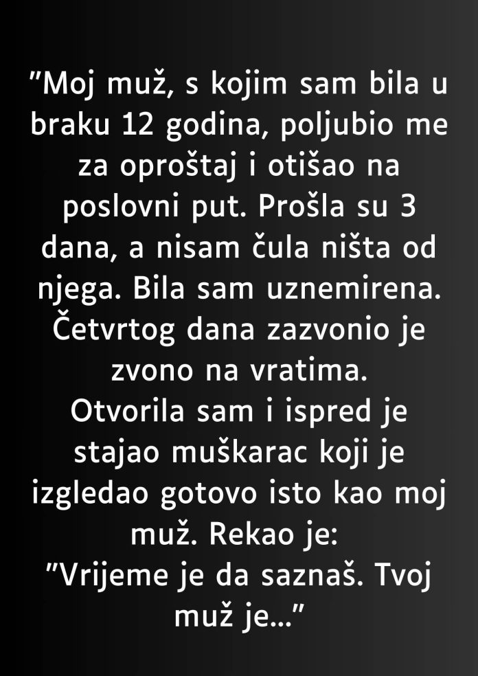 Četvrtog dana, kada je zabrinutost postala nepodnošljiva, na vratima se pojavila neobična figura. Bio je to muškarac koji je izgledao gotovo identično njenom mužu, ali nešto u njegovom pogledu nije bilo u redu. Njegova izjava o tome da je njen muž živ, ali da više nije osoba koju je poznavala, srušila je njen svijet. Otkriće da je njen muž živio pod lažnim identitetom kao dio vojne misije bilo je šokantno. Ova informacija je ne samo promijenila njen pogled na partnera, već je i razotkrila cjelokupni život koji je gradila s njim. Nakon tog iznenadnog otkrića, žena se našla u vrtlogu emocija. Mislila je da poznaje svog muža, a sada se osećala kao da je cijeli njihov brak bio jedna velika laž. Ova situacija je izazvala duboku emocionalnu krizu. Mnoge stvari na koje je nekada gledala s ljubavlju sada su joj delovale kao zamke. Sjećanja na sretne trenutke su se pretvorila u bolne podsjetnike na prevaru koja se dogodila ispod površine.