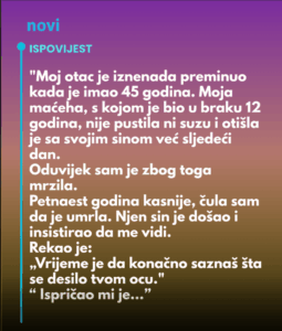 Prolaz vremena nije umanjio osjećaj nepravde. Ipak, sudbina je nakon 15 godina ispisala novo poglavlje. Sin maćehe pojavio se s otkrićem koje je preokrenulo cijeli pogled djevojke na ženu koju je toliko dugo prezirala. Ispričao joj je da je njen otac bio teško bolestan i da je sve krio kako bi zaštitio kćer od patnje. Maćeha, koju je smatrala hladnom i bezosjećajnom, zapravo je voljela toliko snažno da nije mogla ostati ni trenutka u kući nakon njegove smrti. Njen odlazak bio je čin bola, a ne ravnodušnosti, i posljednja iskrena želja da zaštiti i sebe i djevojčicu.