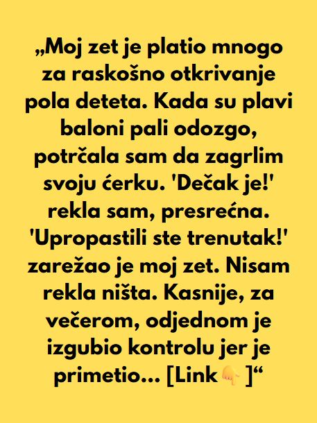 Moj zet je odlučio organizovati raskošnu proslavu otkrivanja pola deteta, što je uključivalo razne dekoracije, tortu, te balone u odabranim bojama. Njegova ideja je bila da stvori poseban ambijent, koji će svi prisutni pamtiti. Kada su plavi baloni pali s neba, to je bio trenutak koji je izazvao euforiju među prisutnima. U tom trenutku, srce mi je bilo ispunjeno radošću. Razmišljala sam o tome koliko će se ovaj događaj pamtiti, ne samo zbog samog otkrića, već i zbog povezanosti koju smo svi osjetili.