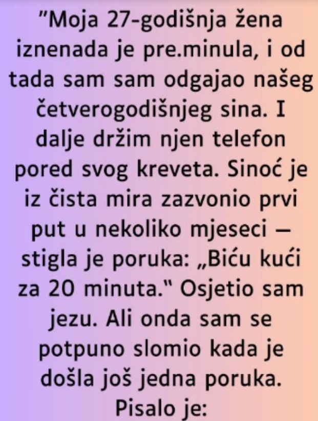Noći su bile posebno teške. Njegov telefon, koji je bio simbol prošlosti, stajao je pored kreveta, neprestano ga podsjećajući na uspomene. Bio je to predmet pun emocija, poruka i sjećanja na ženu koju više nema. Zamišljajući kako je ona ispunjavala svaki kutak njihovog doma, on je osjećao težinu tog praznog prostora. Jedne noći, ekran se upalio, donoseći poruku koja će sve promijeniti. Umjesto očekivane utjehe, došlo je do zastrašujućeg preokreta – poruka je najavila dolazak nekoga u njihov dom, uzrokujući strah koji je potresao njegovo biće.