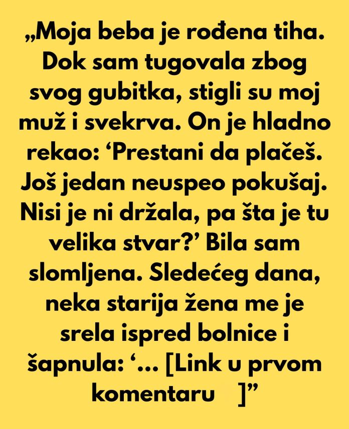 Priča započinje u bolničkoj sobi gdje mlada majka saznaje da je izgubila svoju bebu. Taj trenutak tišine, ispunjen bolom i nevjericom, bio je trenutak koji će zauvijek promijeniti njen život. Dok je osjećala prazninu u svom srcu, njen suprug je, nažalost, bio hladan i distanciran. Njegove riječi, koje su sugerisale da nije bilo razloga za tugu, duboko su je povrijedile. “Prestani da plačeš, to nije velika stvar”, rekao je, ostavljajući je osjećajući se još osamljenije nego prije. U tom trenutku, njihova emocionalna povezanost je počela slabiti, a ona je osjećala da je ostavljena da se suoči sa svojim gubitkom sama.