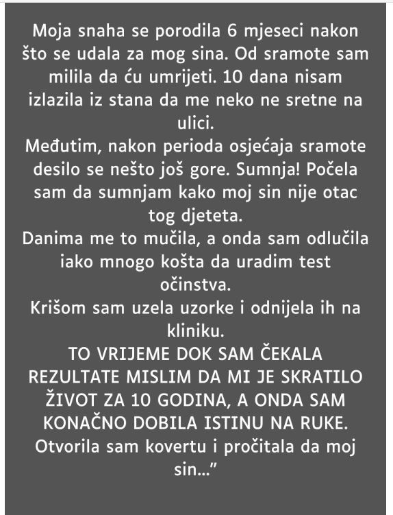 Moj um bio je ispunjen pitanjima: da li je moj sin zaista otac tog djeteta? Ova sumnja nije mi davala mira i na kraju sam donijela tešku odluku – uraditi test očinstva. Test je bio skup, ali nisam mogla ignorisati osjećaj nesigurnosti koji me progonio. Uzimanje uzoraka u potpunoj tajnosti bilo je samo po sebi mučno iskustvo, a čekanje na rezultate se činilo kao vječnost. Svaki dan mi je bio poput agonije, a kad su konačno stigli rezultati, osjećaj šoka bio je nemjerljiv. Moj sin nije bio otac djeteta. Ova vijest je promenila sve. Osim šoka, osjećala sam se kao da sam izgubila svoje mjesto u porodici. Pitajući se kako to da kažem sinu, znala sam da ću morati preuzeti odgovornost za svoje postupke. Odlučila sam se suočiti sa svime, ali nisam ni slutila kakve će posljedice to imati na naše međusobne odnose. U tom trenutku, osjećala sam se kao da sam se suočila s demonima iz prošlosti koje sam godinama potiskivala.