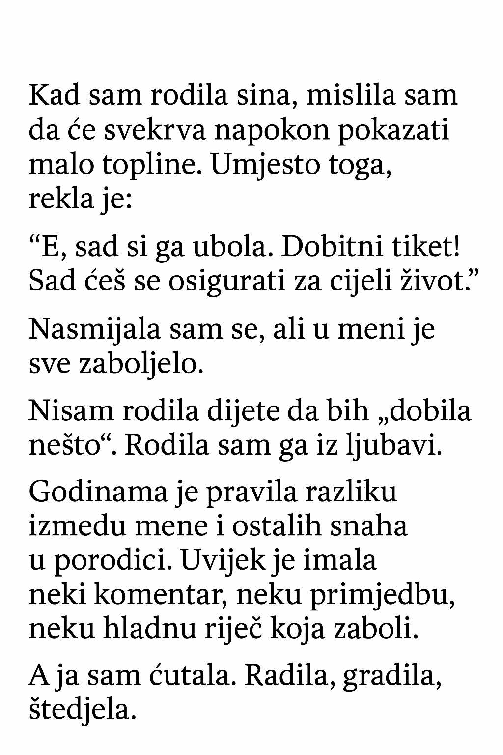 Kada sam postala majka, bila sam ispunjena nadom i srećom, s očekivanjem da će porodica, uključujući i svekrvu, pružiti podršku i ljubav. Ipak, umjesto ohrabrujućih reči, suočila sam se s komentarom koji me duboko povrijedio: „E, sad si ga ubola. Dobitni tiket! Sad ćeš se osigurati za cijeli život.“ Ove reči su zasenile sreću koju sam osećala zbog dolaska mog sina. Rodila sam ga iz ljubavi, ne da bih sebi obezbedila neku vrstu sigurnosti ili beneficija. Osećala sam se kao da me je neko skinuo s oblaka u kojem sam lebdel, a sudar sa stvarnošću bio je neprijatan i bolan.