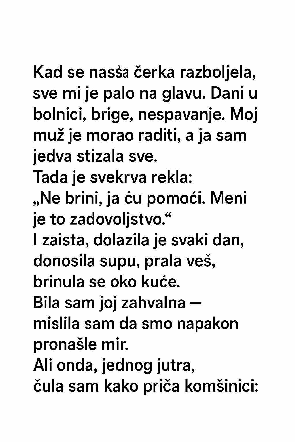 Međutim, u takvim teškoćama, često se pojavljuju i ljudi koji žele pomoći. U međuvremenu, moja svekrva je ponudila svoju pomoć. „Ne brini, ja ću pomoći. Meni je to zadovoljstvo,“ rekla je s osmijehom. U početku sam bila zahvalna. Dolazila je svakodnevno, donosila domaću supu, prala veš i pomagala oko kućanskih poslova. Činilo se kao da smo napokon našle mir, bar na kratko. Činjenica da je neko bio tu da pomogne bila je od suštinske važnosti, jer je omogućila da se fokusiram na ono što je zaista važno — zdravlje moje kćerke. Međutim, taj mir je bio privid, a ispod površine su se počele javljati tenzije i nesuglasice.