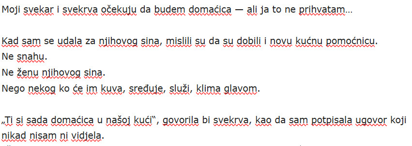 Većina ljudi je svjesna da u mnogim kulturama žene i dalje nose teret tradicionalnih uloga unutar porodice. Svekrve i svekari često očekuju da njihova snaha preuzme zadatke domaćice, što uključuje kuvanje, čišćenje i brigu o djeci. Ova očekivanja često dolaze iz generacija koje su odrasle u društvima gdje je uloga žene bila strogo definisana. U tom kontekstu, ženama se često nameće ideja da je njihov život ispunjen isključivo kroz domaćinstvo. Na primjer, mnoge svekrve smatraju da je njihova snaha uspješna samo ako savršeno vodi domaćinstvo, zanemarujući njene druge talente i ambicije.