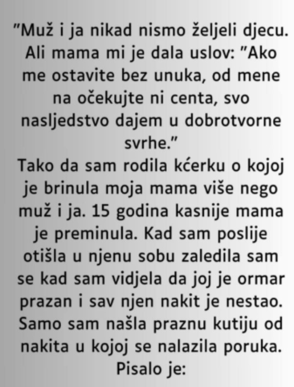 Viralna ispovijest: Odlučivanje o roditeljstvu i nasljedstvu U današnje doba, društvene mreže postale su platforma za dijeljenje iskustava, misli i emocija. Mnoge ispovijesti koje se dijele na ovim mrežama često zadobiju pažnju javnosti, a jedna od njih posebno je potaknula raspravu o temama kao što su roditeljstvo, obiteljski odnosi i nasljedstvo. Ova priča, koja se brzo proširila internetom, govori o mladoj porodici koja se suočila sa teškim odlukama i posljedicama koje su proizašle iz njihovih izbora. Ova situacija nije samo lična, već dodiruje brojne druge porodice koje se suočavaju s istim pitanjima. Ispovijest mladog para Mladi bračni par, koji je odlučio ne imati djecu, naišao je na oštre kritike od strane svojih najbližih. Njihov izbor, koji se činilo razumljivim i ličnim, postao je predmet žestokih rasprava unutar porodice. Odluka da ne postanu roditelji često se doživljava kao tabu tema. U društvu gdje su tradicionalne porodice i roditeljstvo gotovo neupitni standardi, mnogi ljudi imaju snažne stavove o tome šta znači biti roditelj i kakve su obaveze koje s tim dolaze. Ovaj par je, pored vlastitih želja i potreba, bio prisiljen nositi se s predrasudama i očekivanjima koja su im nametnuli članovi porodice. Njihova situacija nije samo individualno pitanje, već odražava širu društvenu dilemu o pravu na izbor. Reakcije porodice Majka mlade žene nije se ustručavala da uputi jasne prijetnje u vezi sa svojim nasljedstvom. Izjavila je: “Ako odlučiš ne dati mi unuke, nemoj očekivati da ćeš dobiti bilo kakav deo mog nasljedstva; svu svoju imovinu namjeravam ostaviti u dobrotvorne svrhe.” Ova izjava nije samo reflektovala njen stav prema roditeljstvu, već je i otkrila duboke obiteljske tenzije koje su se razvijale vremenom. Takve prijetnje često dovode do emocionalnog razdora unutar porodica. Mnogi članovi porodice su se našli pod pritiskom da se usklade sa njenim očekivanjima, što je dodatno pogoršalo situaciju. Nažalost, ovakvi konflikti nisu neobični; mnogo ljudi prolazi kroz slične situacije gdje se ljubav i podrška zamjenjuju prijetnjama i ucjenama, što može imati dugotrajne emocionalne posljedice na sve uključene. Posljedice odluka Kada je majka preminula, mlada žena otkrila je da je njena kćerka postala isključivi korisnik cjelokupnog nasljedstva. Ova vijest dodatno je zakomplicirala situaciju. Mlada žena nije samo izgubila majku, već je i saznala da je nasljedstvo, koje je smatrala svojim pravom, bilo isključeno iz njenog posjeda. Ovo otkriće je izazvalo dodatne emocije i frustracije. Činilo se da je kćerka bila svjesna oporuke i njenih posljedica, što je dodatno pogoršalo odnose između njih. Često se postavlja pitanje kako se nositi s nasljedstvom u kontekstu obiteljskih odnosa. Kada se roditelji suoče s odlukama koje se ne poklapaju s očekivanjima, posljedice mogu biti dalekosežne i emocionalno opterećujuće. Ova situacija nas podsjeća na to koliko je važno razgovarati o ovim pitanjima dok su svi članovi porodice još uvijek živi i zdravi. Šta ova priča može da nas nauči? Priča ovog mladog para je više od puke ispovijesti. Ona otkriva duboku dilemu savremenog društva o roditeljstvu i očekivanjima koja dolaze s njim. Mnogi ljudi se suočavaju s pritiscima porodice i društva kada je u pitanju donošenje odluka o roditeljstvu, a ova priča služi kao podsjetnik da svaka odluka nosi svoje posljedice. Važno je da se osnažimo u svojim odabirima i da budemo spremni suočiti se s posljedicama koje mogu proizaći iz njih. Ova situacija takođe naglašava potrebu za otvorenom komunikacijom unutar porodice. Kada se o ovim temama ne razgovara, često dolazi do nesporazuma i sukoba koji mogu trajati godinama. Odbacivanje tradicionalnih normi može donijeti slobodu, ali i izazvati sukobe koji se moraju riješiti na zdrav način. Refleksija o obiteljskim vrijednostima Obiteljski odnosi su kompleksni i često su isprepleteni s očekivanjima i tradicijama. Ova ispovijest nas podsjeća na važnost otvorene komunikacije unutar porodice. Umjesto da se suočavamo s prijetnjama i ucjenama, treba raditi na izgradnji razumijevanja i poštovanja među članovima porodice. Uvijek je bolje tražiti zajedničko rješenje koje može zadovoljiti sve strane, nego se zatvarati u okvire vlastitih stavova i očekivanja. Ovaj pristup može pomoći da se spriječe budući konflikti i zadrži emocionalna bliskost unutar porodice. Često se zaboravlja da su obiteljski odnosi zasnovani na ljubavi i podršci, a ne na materijalnim stvarima ili očekivanjima. Kraj priče ili novi početak? Kao i svaka dobra priča, i ova se može posmatrati kao početak nečega novog. Odabir da ne postanu roditelji može otvoriti vrata novim mogućnostima i životnim putem. Porodica i nasljedstvo su samo jedan aspekt života, a važno je prepoznati da postoje i drugi načini za ostavljanje naslijeđa i uticaja na svijet. Ova priča može inspirisati mnoge ljude da razmotre svoje prioritete i vrijednosti, te da se usmjere na ono što im zaista čini sretnima. U konačnici, svaki pojedinac ima pravo na vlastiti put, bez obzira na to kako se taj put uklapa u tradicionalne norme. Ova priča nas poziva da preispitamo vlastite stavove i uvjerenja, te da se oslobodimo tereta tuđih očekivanja kako bismo pronašli svoj vlastiti put ka sreći i ispunjenju.