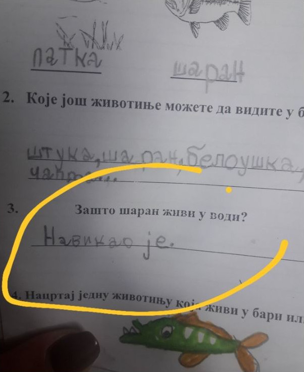 U školskoj učionici, tokom testa iz predmeta „Svijet oko nas“, postavljeno je pitanje koje je, naizgled, imalo jednostavan i jasan odgovor: „Zašto šaran boravi u vodi?“ Dok su većina učenika davali odgovore zasnovane na biologiji, jedan dječak je, sa svojom nevjerojatnom iskrenošću, odgovorio: „Upoznat je s tim.“ Ovaj odgovor nije samo odjeknuo učionicom već je i izazvao lavinu smijeha, ali i dubokog razmišljanja o tome kako često zaboravljamo na jednostavnost u kompleksnom svijetu. Dječakov odgovor je, na neki način, bio osvježavajući podsjetnik da često tražimo složena objašnjenja za stvari koje su u svojoj suštini jednostavne.