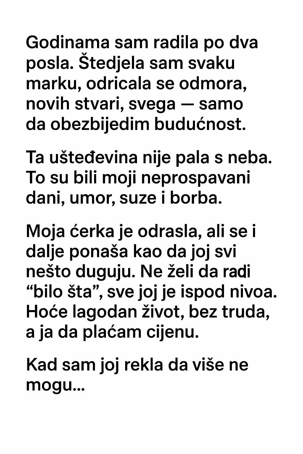 U svijetu koji se stalno mijenja, mnogi pojedinci se suočavaju s izazovima koji zahtijevaju iznimne napore i odricanja. Problemi s kojima se suočavamo često su složeni i zahtijevaju duboko razumijevanje ne samo našeg ličnog stanja, već i šireg društvenog konteksta. Moja priča nije izuzetak. Godinama sam radila po dva posla kako bih osigurala bolju budućnost za svoju porodicu. Svaka marka koju sam uspjela uštedjeti nije rezultat sreće, već su to dugi sati rada, umor i često suze koje su pratile svaku borbu za opstanak. Ovo je priča o ljubavi, trudu i naposljetku, o granicama koje smo spremni postaviti.