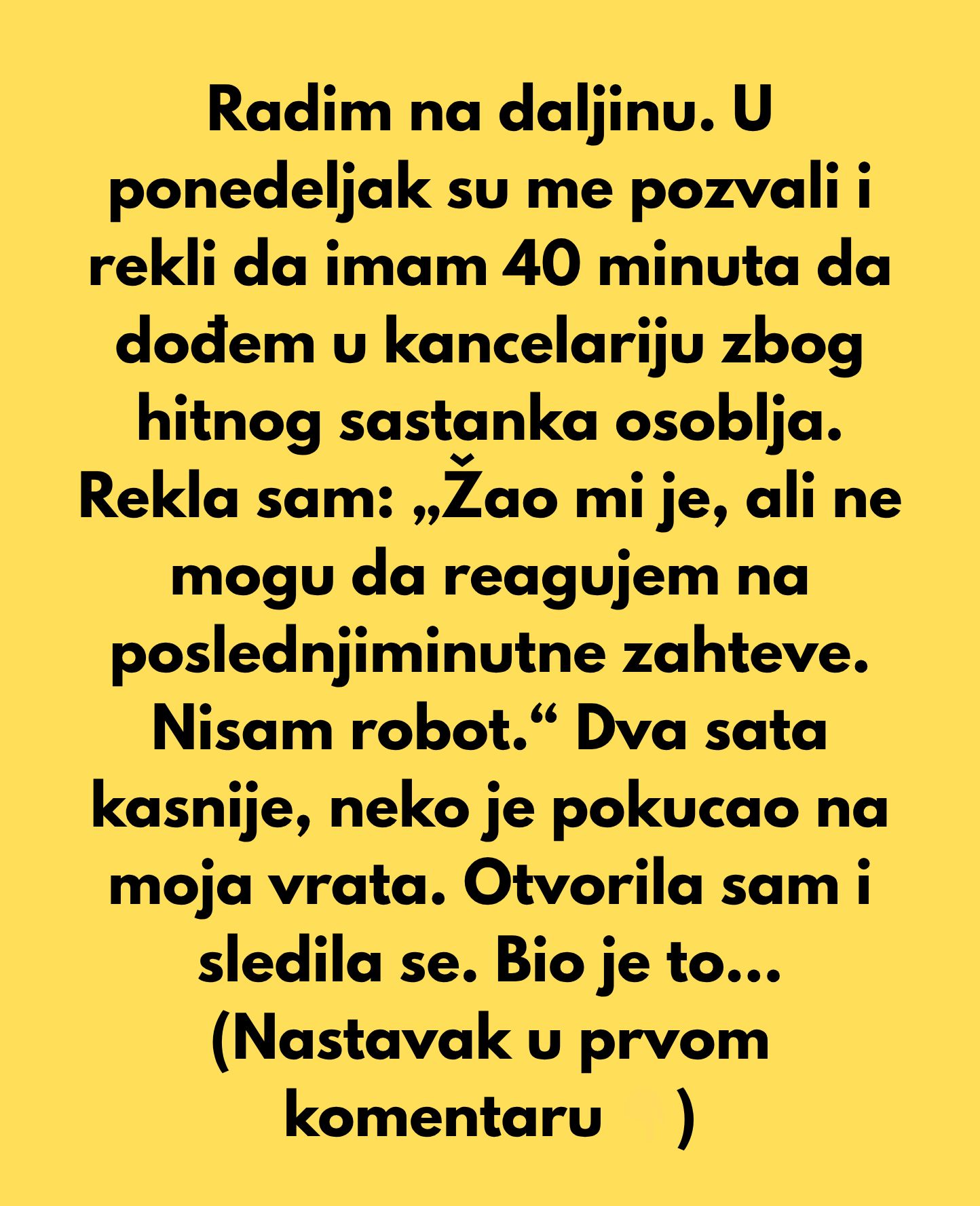 Osobe koje rade na daljinu često se suočavaju s potrebom da se zauzmu za sebe i svoja prava. U ovom slučaju, zaposlenica se suočila s izazovom da balansira između profesionalne odgovornosti i ličnih granica. Mnogi se pitaju: Da li je pogrešno odbiti zahtjev koji dolazi u posljednjem trenutku? Ova dilema može izazvati dodatni stres, a reakcije na takve situacije mogu varirati od osobe do osobe. Važno je da zaposleni prepoznaju svoje granice i budu spremni da ih postave, jer to može značajno uticati na njihovo emocionalno i mentalno zdravlje.Na kraju, važno je prepoznati da je rad na daljinu izazovan i da zahtijeva drugačiji pristup upravljanju timovima i komunikaciji. Osim što je potrebno razviti fleksibilne politike, kompanije bi trebale osigurati da njihovi zaposlenici imaju priliku izraziti svoje stavove i osjećaje bez straha od posljedica. U suprotnom, može doći do smanjenja motivacije i zadovoljstva poslom, što dugoročno može uticati na uspješnost cijele organizacije. Zaposleni se često osjeća izolovano i kao da nemaju podršku kada su suočeni sa ovakvim situacijama, stoga je ključno raditi na izgradnji zajednice unutar kompanije.