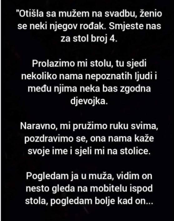 Naizgled obična svadbena večer, ispunjena smehom i veseljem, može postati trenutak koji će promeniti sve. Ova priča istražuje duboke emocionalne posledice koje se mogu javiti kada se poverenje partnera naruši, i to bez fizičke prevare. Prateći svog supruga na svadbu jednog od njegovih rođaka, žena je očekivala da će večer biti slična mnogim prethodnim, ispunjenim poznatim licima i površnim razgovorima koji se lako zaborave. Međutim, ono što se dogodilo te večeri probudilo je u njoj osećaje koje je dugo potiskivala, otvarajući vrata dilema koje su naizgled bile daleko od njene svakodnevice.