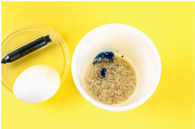 Najzabavniji dio nastaje kada počnete farbati jaja pirinčem. U kesicu sa zip zatvaračem ili malu plastičnu posudu, stavite oko pola šolje suvog pirinča. Zatim, preko pirinča dodajte pet do deset kapi prehrambene boje, zavisno od intenziteta boje kojeg želite. Zatvorite kesicu ili posudu i dobro protresite kako bi se boja ravnomjerno rasporedila po zrncima pirinča. Ovaj korak daje osnovu za mozaik efekt koji će kasnije doći do izražaja.