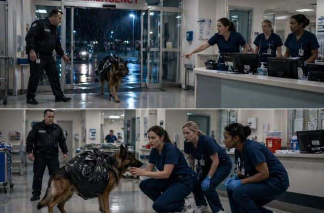 Odjednom, mirnu atmosferu prekinuo je glasni lavež. Osoblje je prvo bilo zbunjeno, ne znajući odakle dolazi taj zvuk. U tom trenutku, automatska vrata su se otvorila, a unutra je ušao veliki njemački ovčar, natopljen kišom. Na leđima je nosio crnu kesu za smeće, koja je dodatno podstakla znatiželju prisutnih. Dok je hodao ka recepciji, ostavljao je mokre tragove, a osoblje je s nevjericom posmatralo taj neobičan scenario. U bolnici, gdje su svi navikli na neočekivano, ovakav prizor bio je izvan svake mašte.