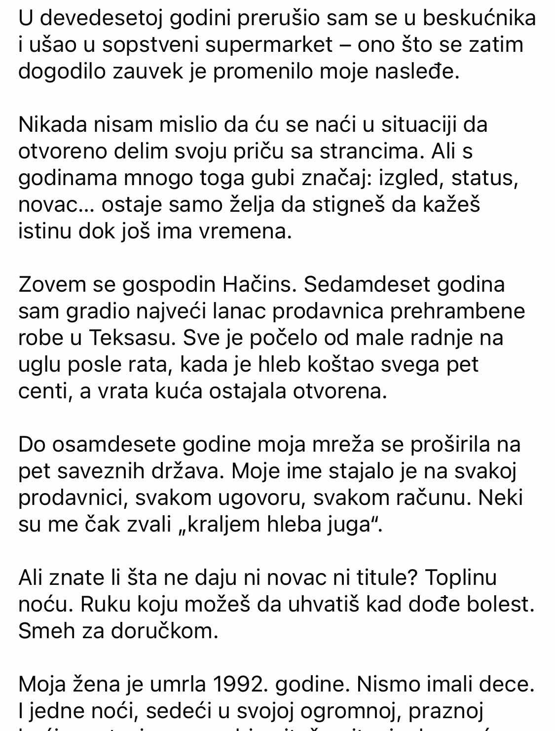 Na kraju, ovaj emotivni put nas uči da bogatstvo nije u materijalnim stvarima, već u ljubavi, saosećanju i sposobnosti da učinimo svet boljim mestom. Glavni junak, sada stariji i mudriji, shvata da njegovo nasleđe nije u novcu ili poslovima koje je izgradio, već u **dobrim delima** koja će trajati i nakon njega. Osvrćući se unazad, sa osmehom shvata da je postigao mnogo više nego što je ikada mogao zamisliti – ostavio je trag dobrote u životima drugih. Njegova priča postaje inspiracija za sve nas, podsećajući nas na to da istinska vrednost leži u onome što činimo za druge i kako se ponašamo prema svim ljudima, neovisno o njihovom statusu ili imovinskim stanju.