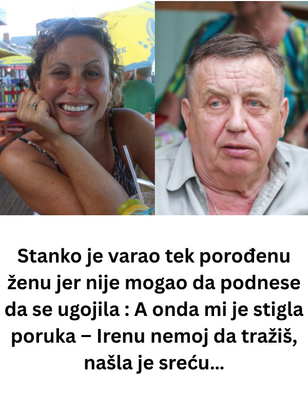 Irena, njegova supruga, bila je žena koja je s ljubavlju i trudom gradila njihov dom. Njena trudnoća bila je izazovna, a njeno tijelo se drastično mijenjalo. Iako je nosila teret novog života, Stanko je počeo gubiti interes za nju. Umjesto da je podrži i pruži joj potrebnu pažnju, sve više je izražavao nezadovoljstvo njenim izgledom i promjenama koje je trudnoća donijela. Dok se Irena borila s umorom i iscrpljenošću, Stanko je bio sve manje prisutan, emocionalno se povlačeći u svoj vlastiti svijet. Taj proces udaljavanja bio je postepen, ali itekako primjetan, kako za Irenu, tako i za ljude iz njihove okoline.