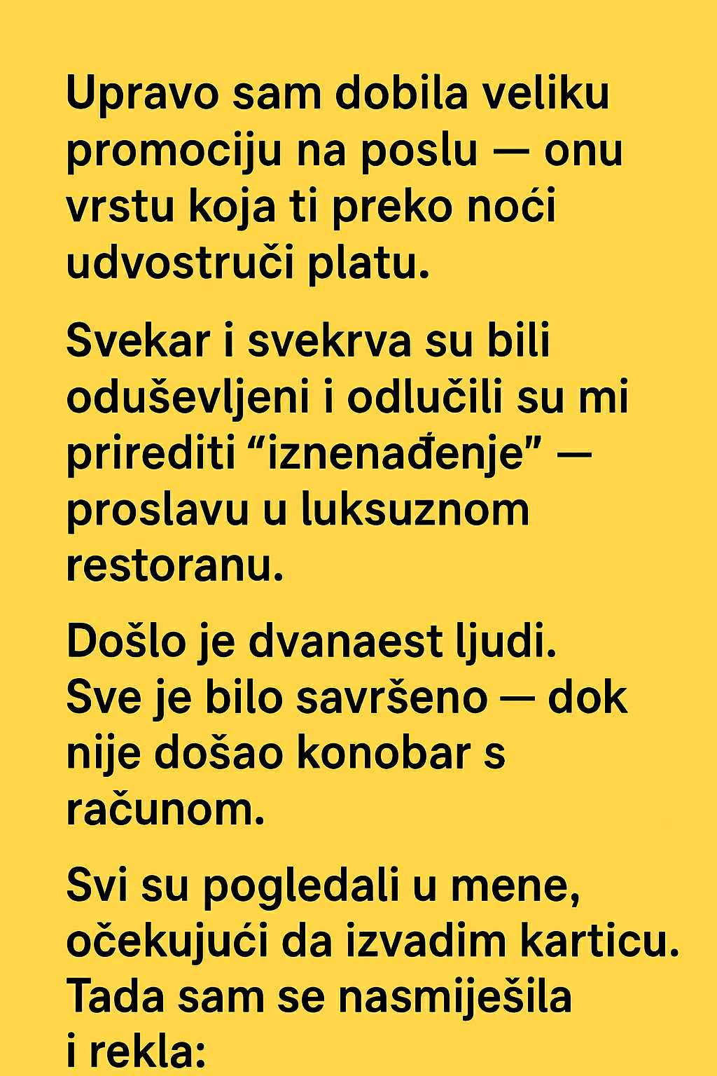 Nedavno sam doživjela jedan od najvažnijih trenutaka u svojoj karijeri — dobila sam značajnu promociju koja je udvostručila moju platu. Ova vijest nije samo promijenila moj profesionalni status, već je i izazvala val radosti među mojim najbližima, posebno među mojim svekrom i svekrvom. Njihova sreća bila je očita, a odlučili su da proslavu ovog posebnog trenutka prirede na način koji ću pamtiti cijeli život. Kada sam čula o njihovim planovima, srce mi je bilo ispunjeno radošću, ali i pomalo nestrpljivošću, jer nisam znala šta očekivati od proslave.