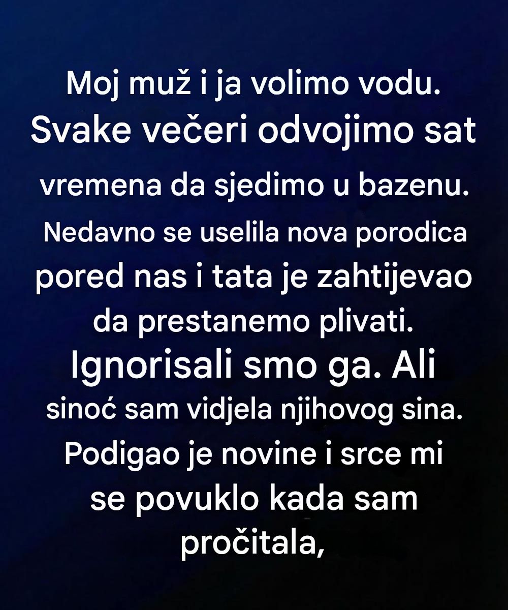 Kako su dani prolazili, dječak koji je prvotno donio poruku ponovo se pojavio pored ograde, ovaj put bez papirića, već s osmijehom i tiho mahanje. Ovaj mali gest bio je snažniji od bilo kakvog izvinjenja. Supružnici su tada shvatili da njihova večernja rutina više nikada neće biti samo rutina. Bazen je postao simbol nečega većeg — simbol razumijevanja, saosjećanja i ljudske povezanosti. Njihova priča nije bila samo o rješavanju sukoba, već o izgradnji odnosa koje povezuje empatija i spremnost na komunikaciju.
