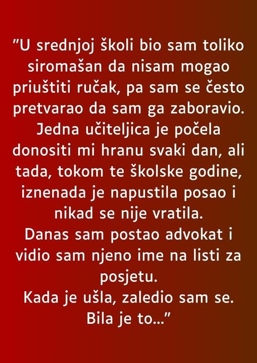 Jednog dana, dok je pregledavao svoj raspored, ugledao je ime koje mu je odmah privuklo pažnju. Bio je to naziv koji je nosio sjećanje na učiteljicu, a srce mu je na trenutak stalo kada je ona ušla u njegovu kancelariju. Ona više nije bila ona snažna žena koju je pamtio, već krhka figura s očima koje su i dalje zračile ljubaznošću, ali su nosile teret godina. Taj susret bio je emotivan, a dječak, sada muškarac, osjetio je kako se njegov um vraća u prošlost, u te teške dane kada je upravo ta žena bila svjetionik u njegovom životu. U tom trenutku, shvatio je da su sudbine često isprepletene. Prije mnogo godina, ona je bila njegova podrška, a sada je došla kod njega u potrazi za pomoći. Njihovi putevi su se ponovo ukrstili, a on je bio odlučan da joj uzvrati svu ljubaznost i podršku koju je ona nekada pružila njemu. Njihovi razgovori su se pretvorili u emocionalnu razmjenu, gdje su se sjećali starih vremena i pričali o tome kako im je život oblikovao sudbinu.