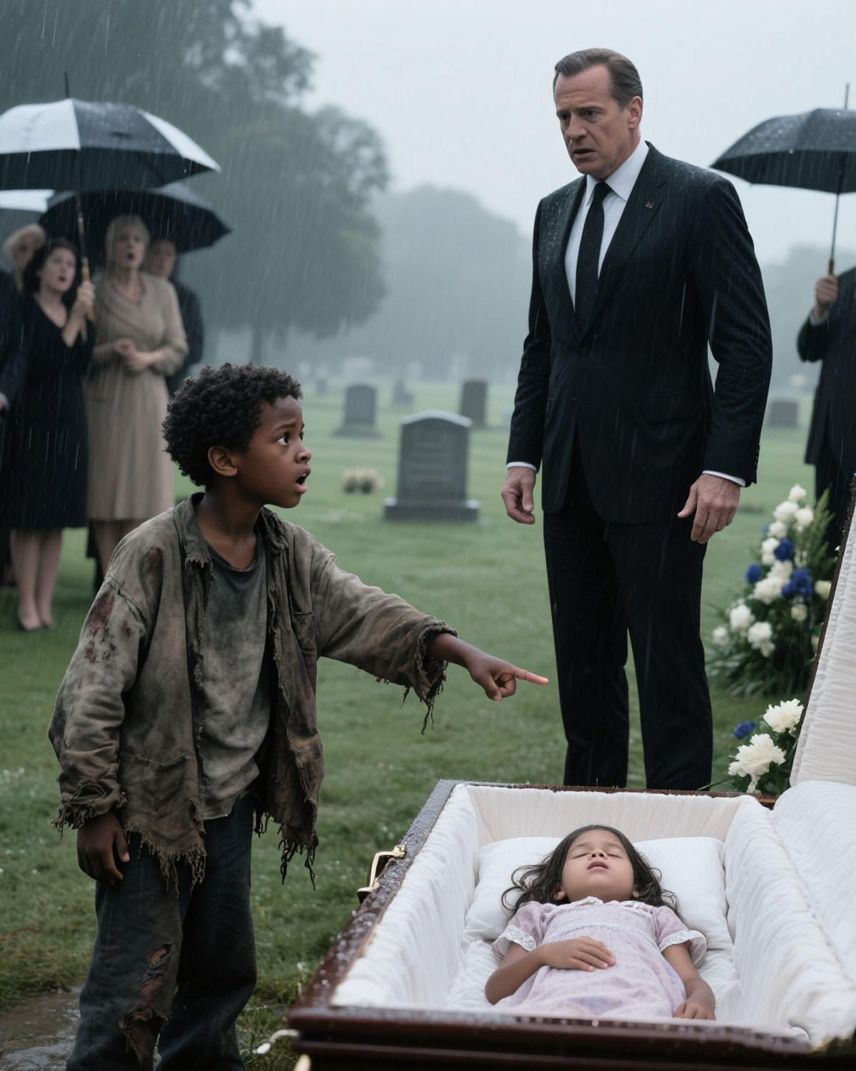 Dok su gosti pokušavali pronaći mir u svojoj tuzi, iznenada je nastao metež na rubu okupljanja. Mršavi dječak, obučen u dronjke i blatnjave cipele, probijao se kroz masu, njegov izraz lica bio je pun panike. Njegov drhtavi glas odjeknuo je kroz tišinu: „Stanite! Emily nije mrtva! U tom lijesu je netko drugi!“ Ova izjava izazvala je šok među okupljenima, dok su neki počeli sumnjati u svoje percepcije. Richard nije mogao vjerovati svojim ušima; srce mu je ubrzano kucalo dok je pokušavao shvatiti situaciju koja se odvijala pred njim. Dječakova izjava nije bila samo nevjerovatna, već je pokrenula lavinu pitanja. Šta ako je u pravu? Šta ako njegova kćerka nije mrtva? Ova misao se počela vrtjeti u Richardovoj glavi, dok su se gosti međusobno ispitivali. Da li neko uopće zna ko je taj dječak? Njegova pojava bila je potpuno neobična, kao i njegova tvrdnja, ali u trenutku punom tuge i izgubljenosti, ona je postala fokus rasprave. U tom trenutku, Richard je shvatio da se mora suočiti s ovim pitanjem, bez obzira na to koliko mu nekontrolirano izgledalo.